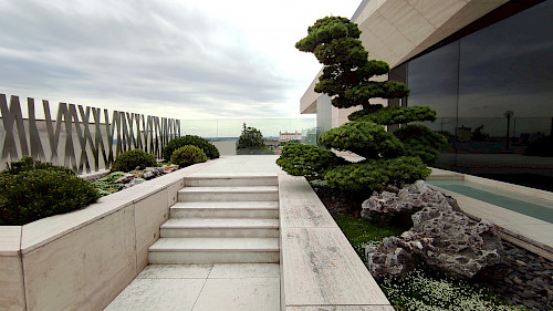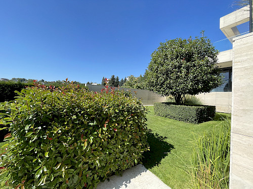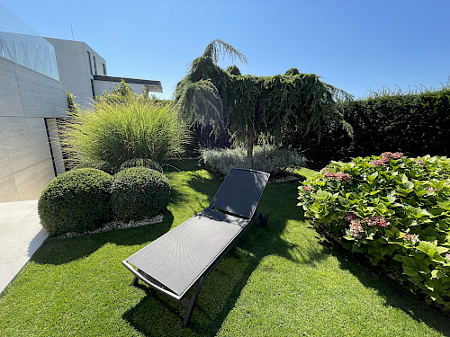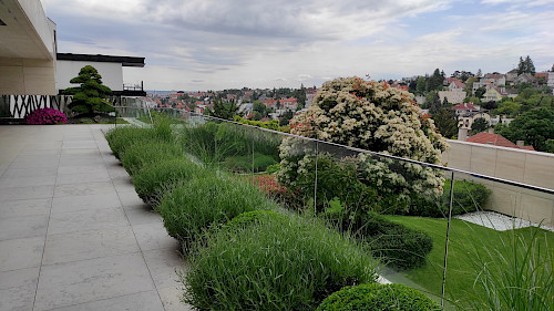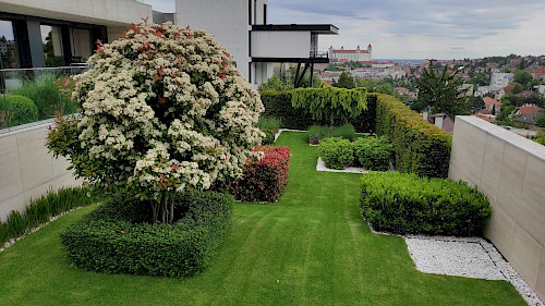 Realizácia a následná údržba modernej súkromnej záhrady v Bratislave. Kombinácia pravidelných tvarov a tvarovaných vegetačných prvkov.